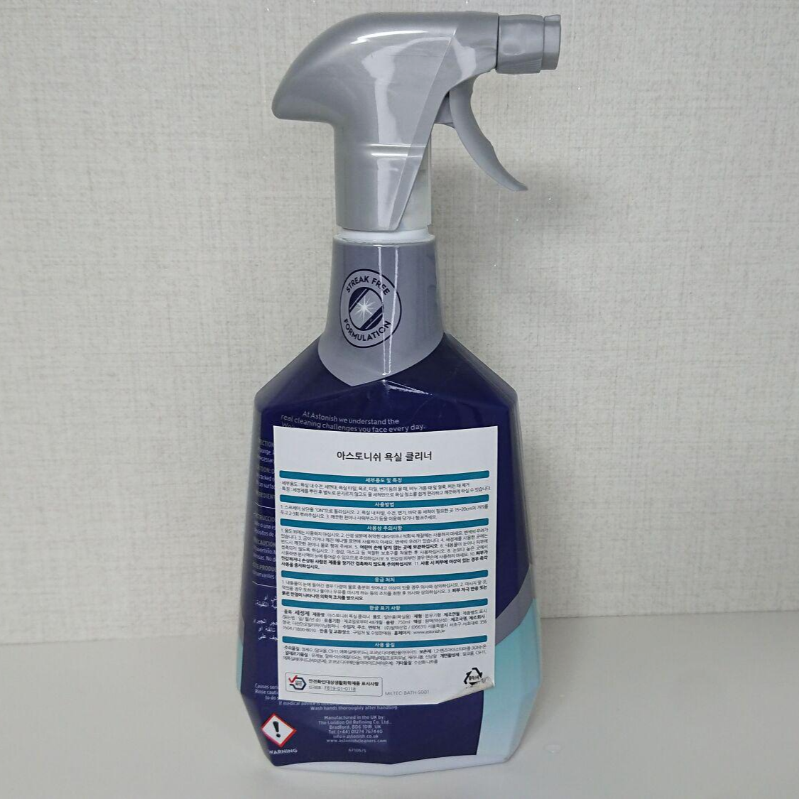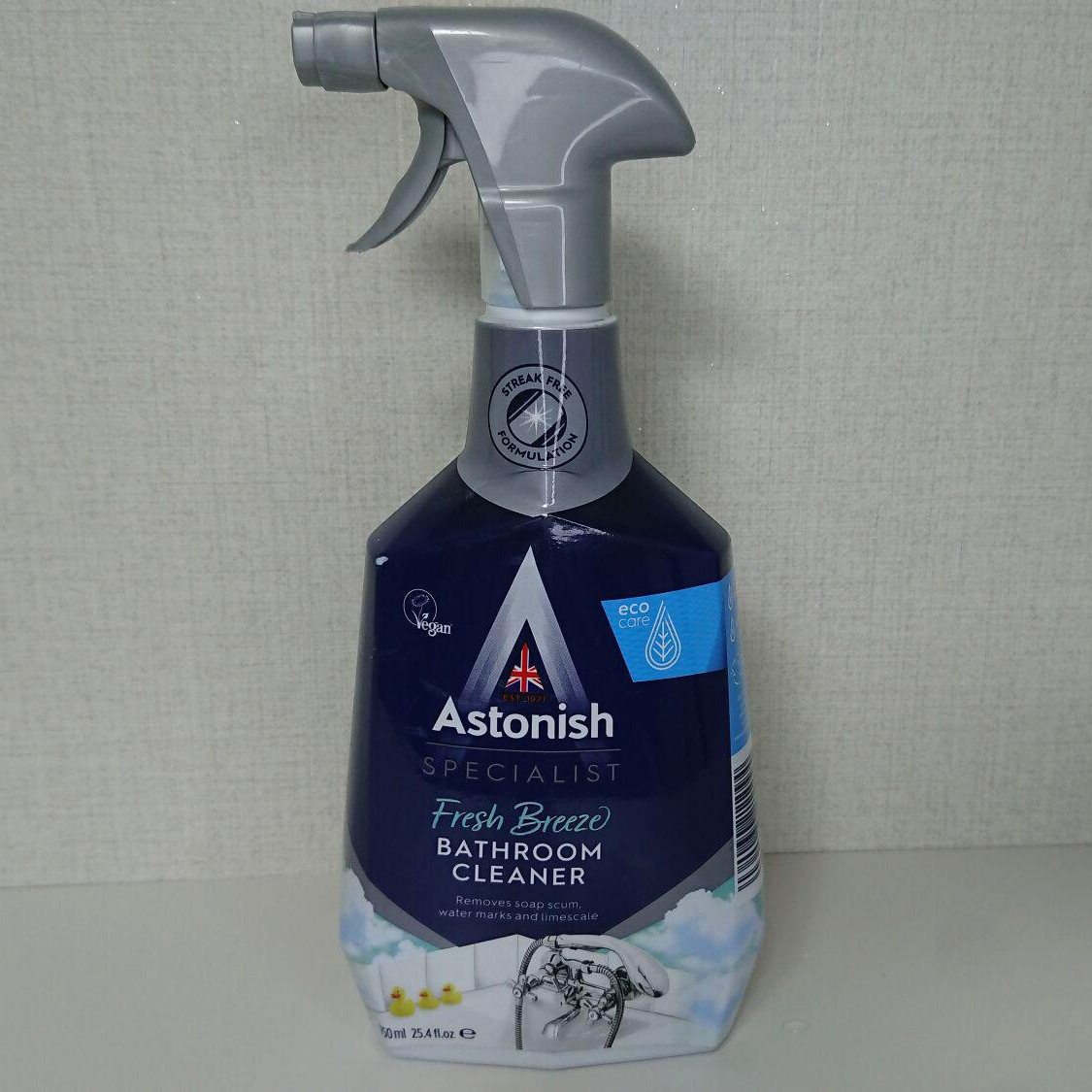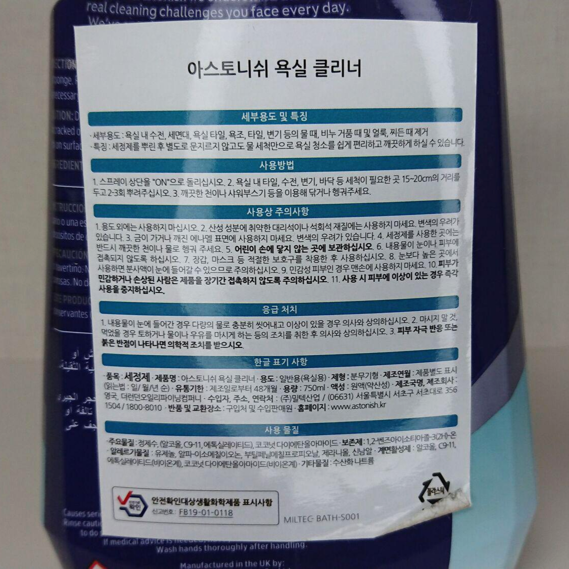 제품 후면부에는 한글로 "아스토니쉬 욕실 클리너"로 표기되어 있습니다.